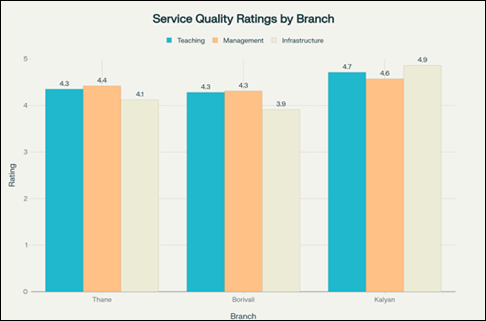 · Infrastructure: Significant variation observed, with Borivali showing concerns at 3.91 while Kalyan excels at 4.86